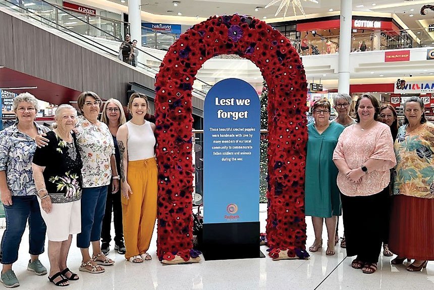 Dads supporting their daughters at the annual TuffKids triathlon day. Tony Orchard with Ruby, Stephano Marmotta with Estelle and Greg Forster with Gabriella.“Songs That Won the War” performers, Alex Andujar and Alison Drew take a break from the show at intermission.Former long-time Ipswich Greyhound Club secretary, Merv Page, made a return appearance to the track for the club’s major race day of the year, he joined the team from the Bendigo BankSusan Fox-Andrews with mum Helen Lang and sister Jennifer Lang. The three loved the “Songs That Won the War” performance.Redbank Plains weekly craft group crocheted 800 red poppies for the centre’s Remembrance Day Arch.